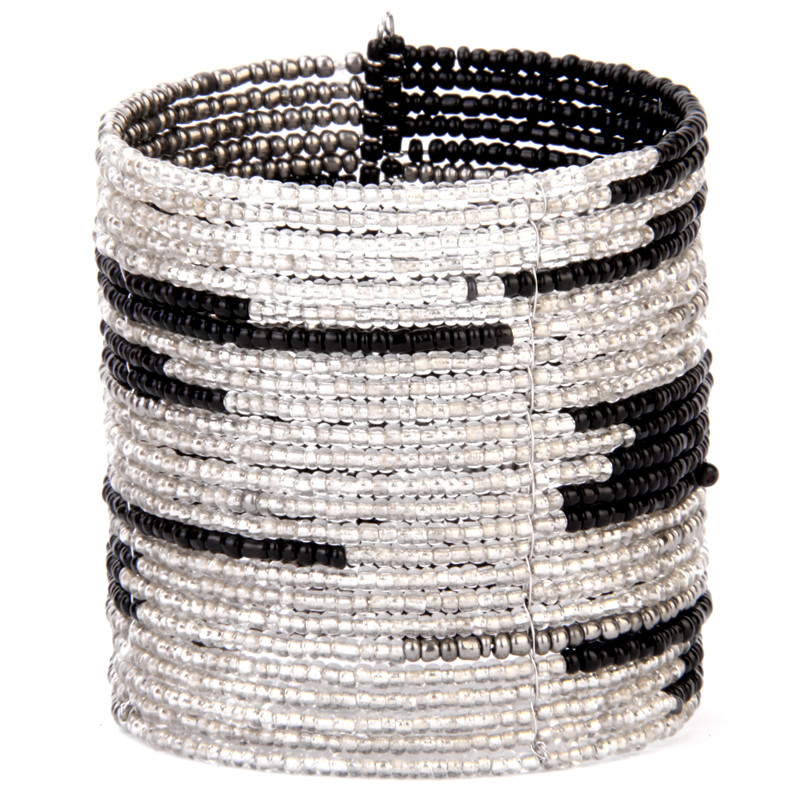Mixed style open cuff bracelet. Staggered color lines of wired glass beads, slips on easily.