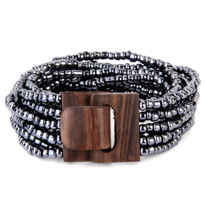 Multi-strand stretch bracelet. Beaded strands gather into small Sono wood buckle.