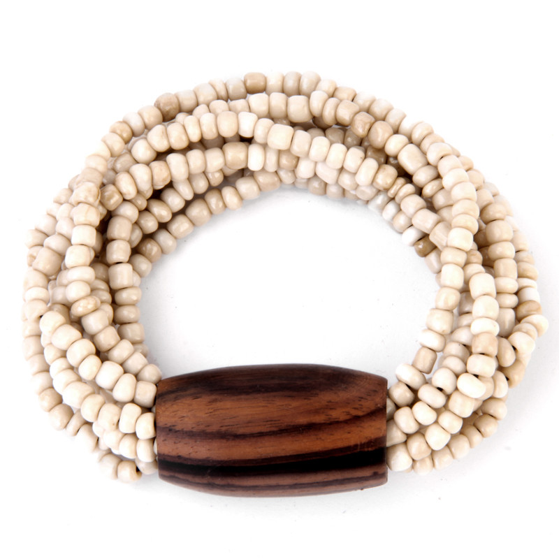 Multi-Strand Wood Barrel Bracelet in Antiqued Cream.