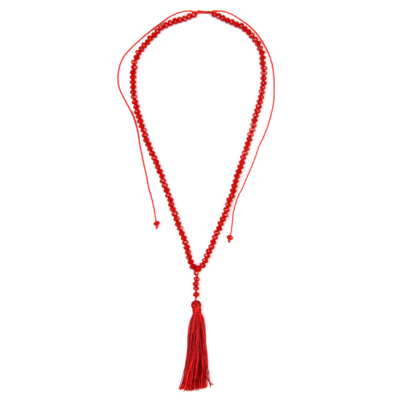 Crystal glass bead necklace with tassel pendant and accent beads.