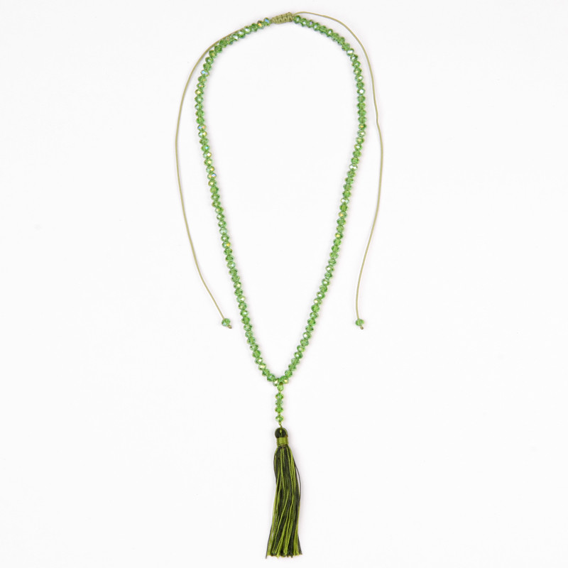 Crystal Bead Tassel Necklace in Green, Lime.