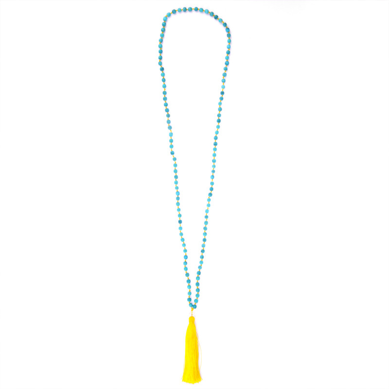 Turquoise wood beads, yellow hand-knotted thread and tassel, clear faceted accent bead.