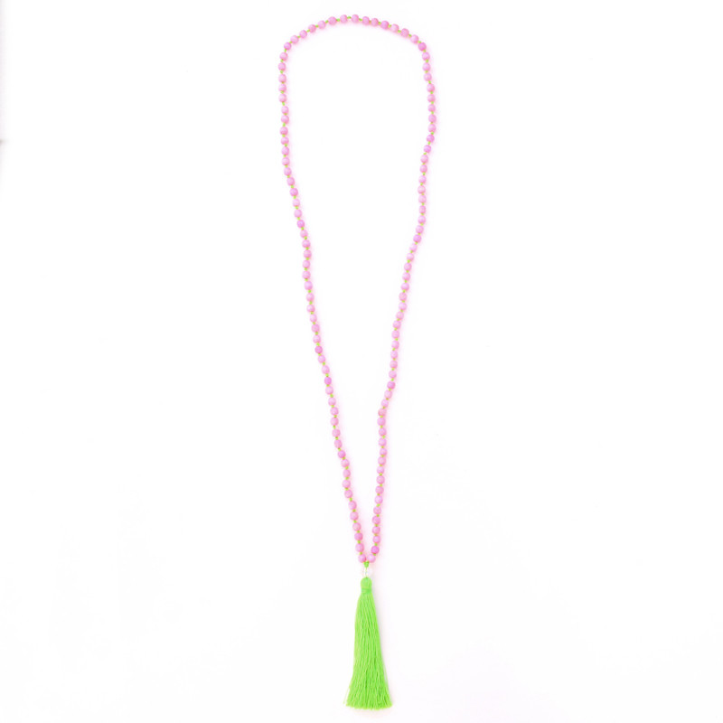 Wood Bead & Tassel Necklace, Pink Lime Clear .