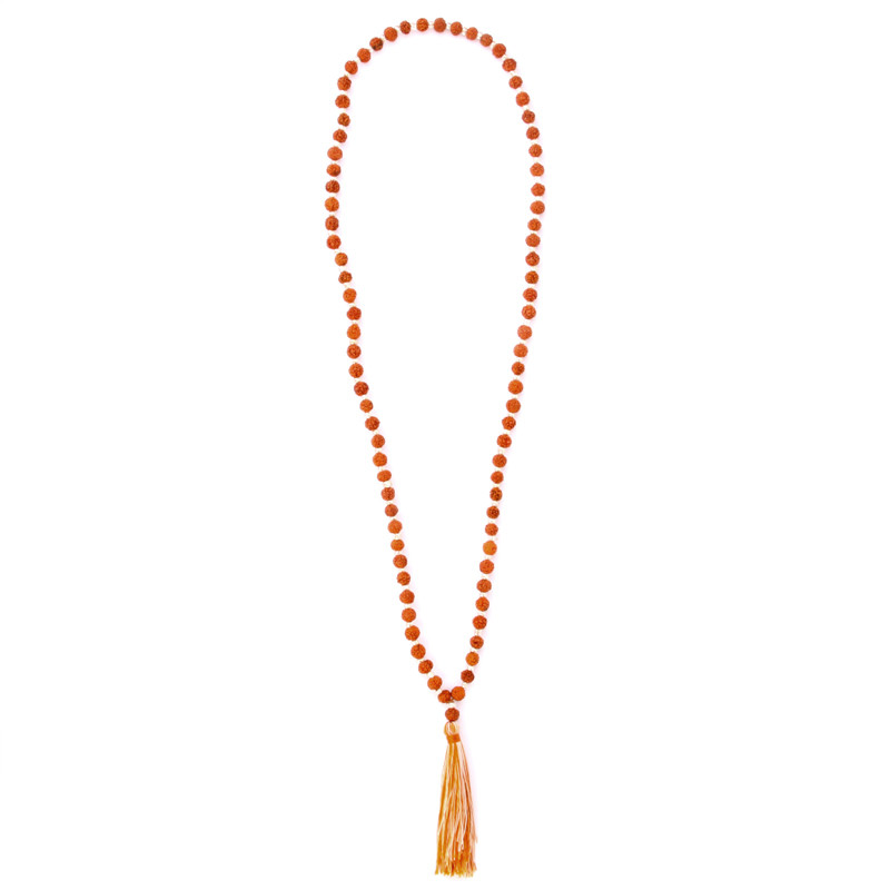 Mala, 108 bead count. Rudrashka seeds beaded on hand-knotted cord with mixed orange tassel.