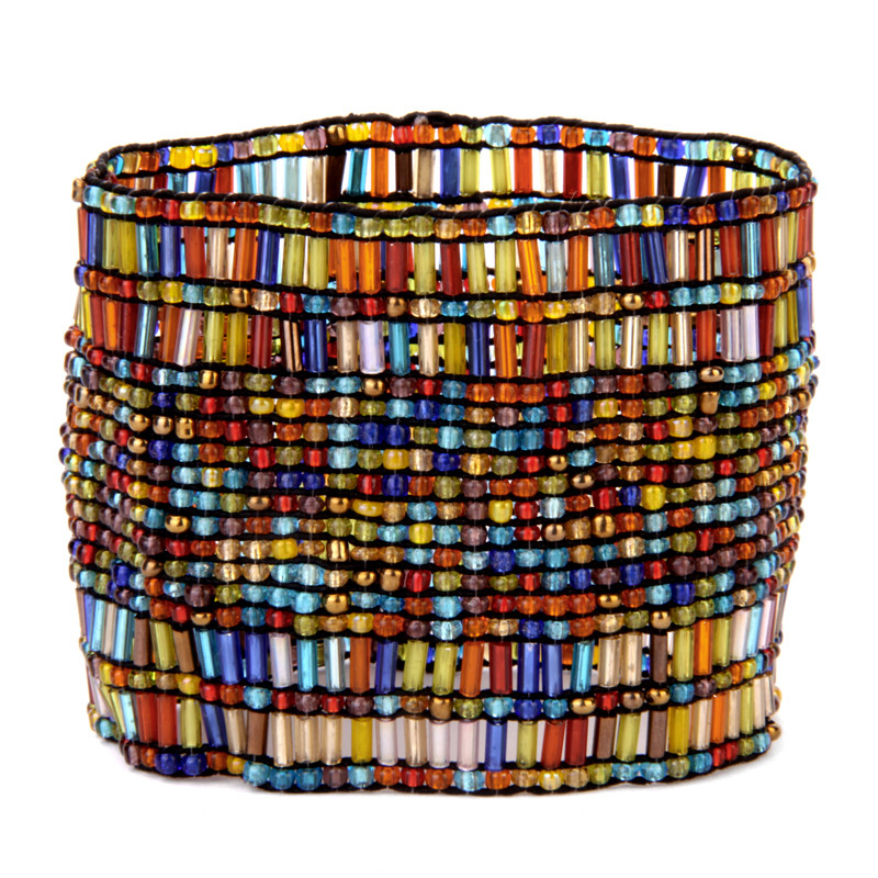 Bugle framed seed bead stretch bracelet. 2 rows glass bugle beads frame seed bead rows.
