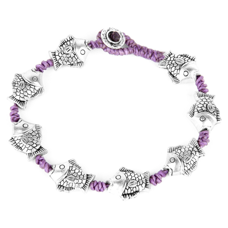 Metal Fish Beads on Cord Bracelet in Purple, Silver.