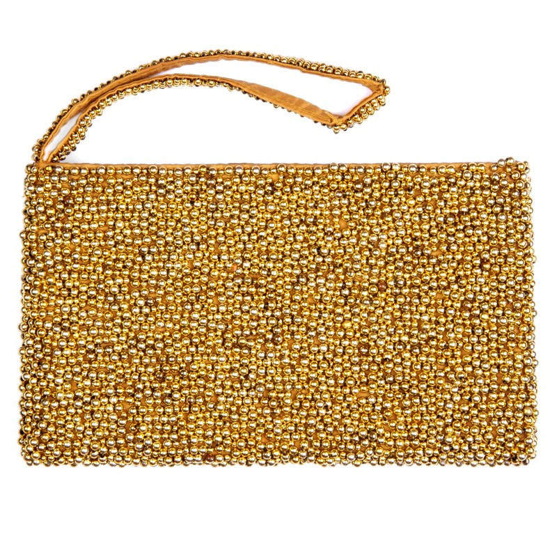 Beaded Metallic Wristlet Clutch in Gold.