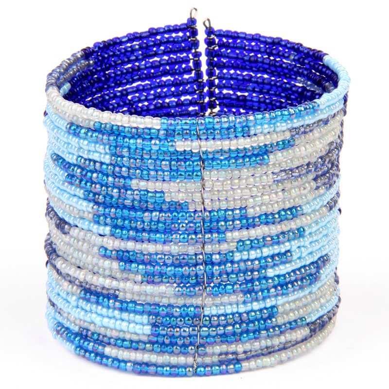 Navo style cuff bracelet. Staggered color lines of wired glass beads, slips on easily.