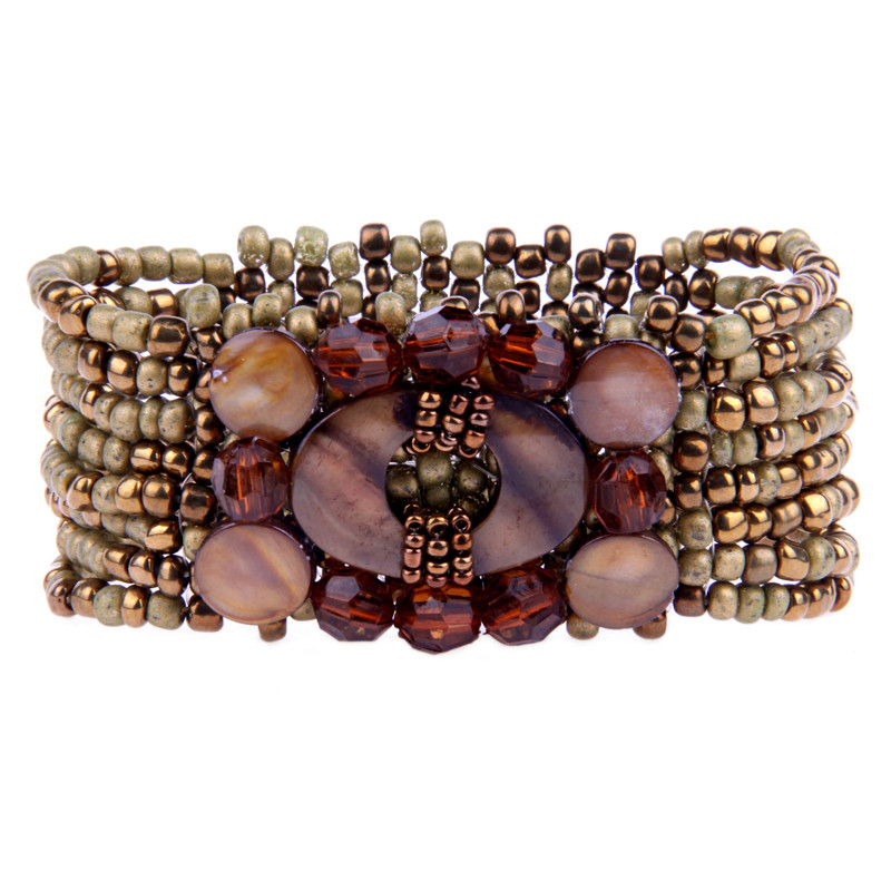 Semi-precious stone and Java glass embellished stretch cuff bracelet.