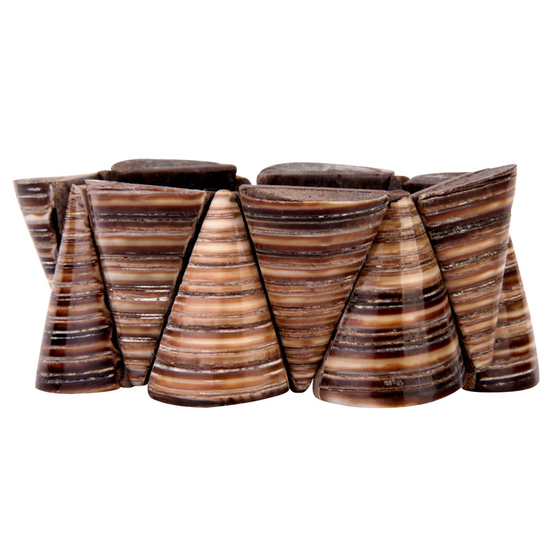 Striped triangle shell stretch bracelet; each shell mounted on hand carved wood.