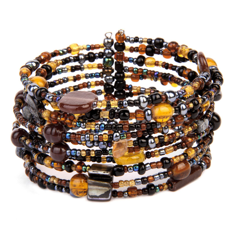 Rows of java and glass beaded wire give the illusion of many bracelets, separate rows come together at side opening.
