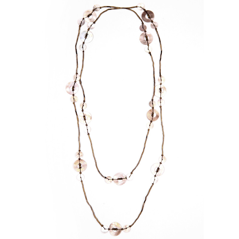 MOP discs on bugle beaded strand bead necklace. MOP = Mother of pearl.