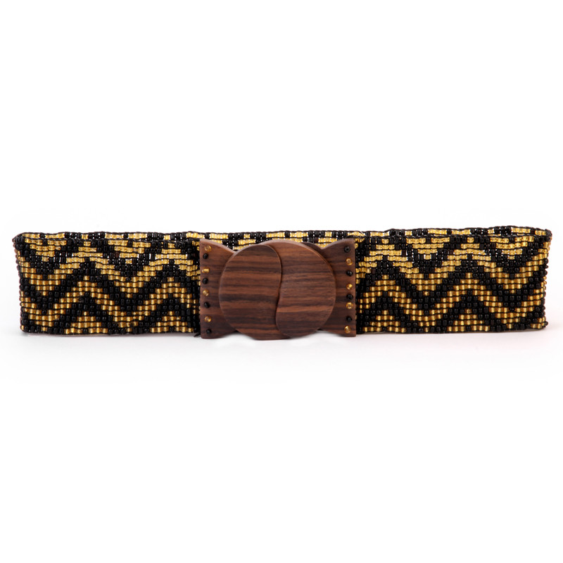 Zig Zag Stretch Belt, Wood Buckle in Black & Gold.