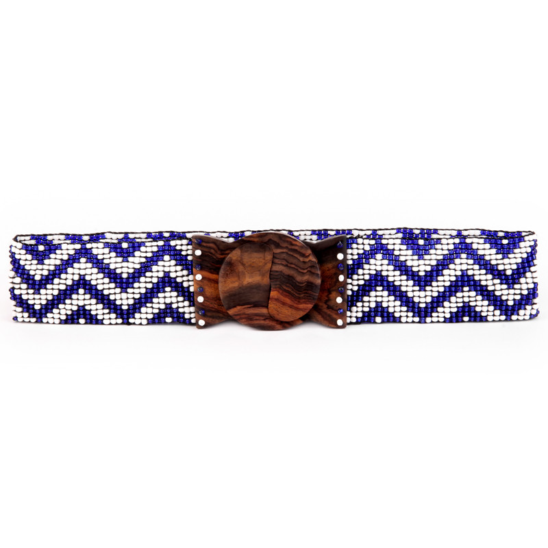 Zig Zag Stretch Belt, Wood Buckle in Blue & White.