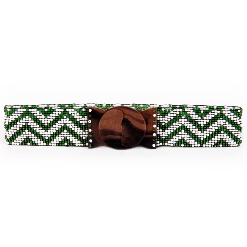 Zig Zag Stretch Belt, Wood Buckle in Green & White.