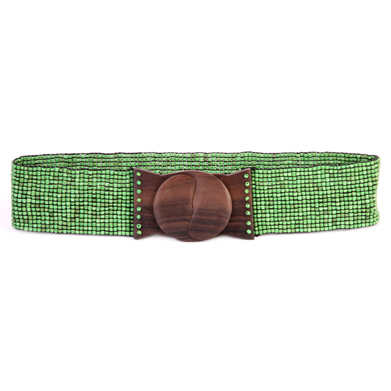 Solid Color Stretch Belt, Wood Buckle, Antiqued Green.