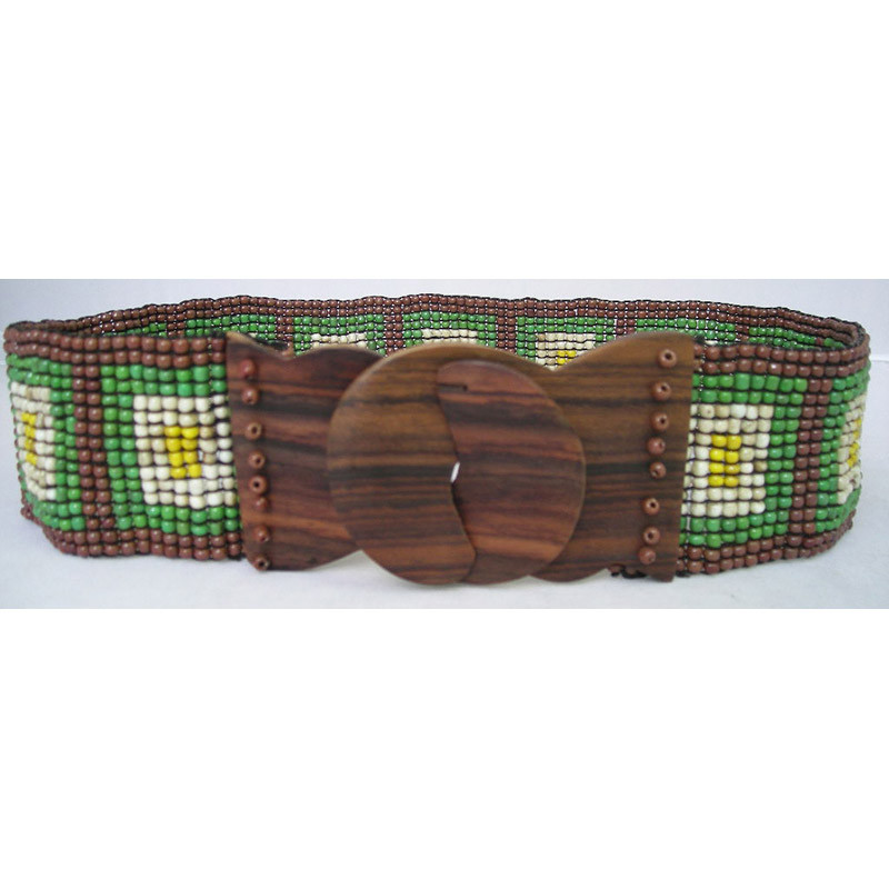 Squares Stretch Belt, Wood Buckle, Antique Brown, Green, Cream, Yellow.