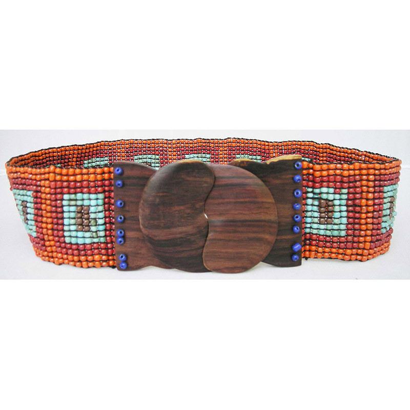 Squares Stretch Belt, Wood Buckle, Antique Orange, Red, Turquoise.