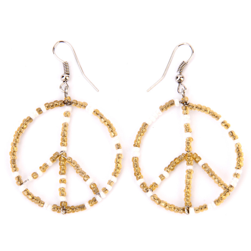 Peace Sign Beaded Earring in Gold & White.