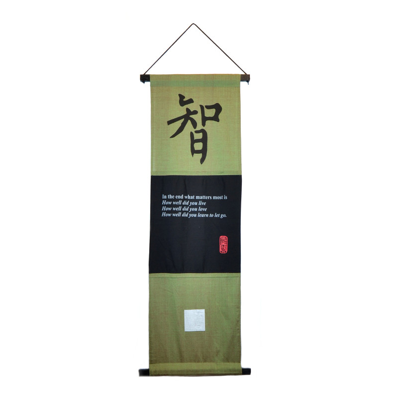 Our wall quote hangings are made by a cooperative of women in the village of Klung Kung. 100% cotton fabric is hand loomed, paneled and screen printed; wood stability rods are hand painted as well. Hang from attached cord.