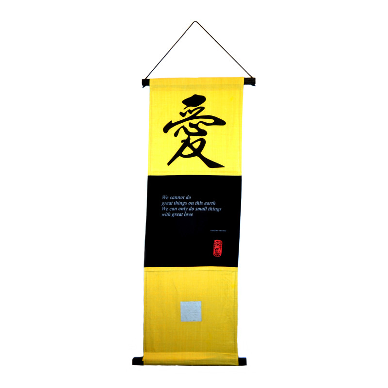 Our wall quote hangings are made by a cooperative of women in the village of Klung Kung. 100% cotton fabric is hand loomed, paneled and screen printed; wood stability rods are hand painted as well. Hang from attached cord.