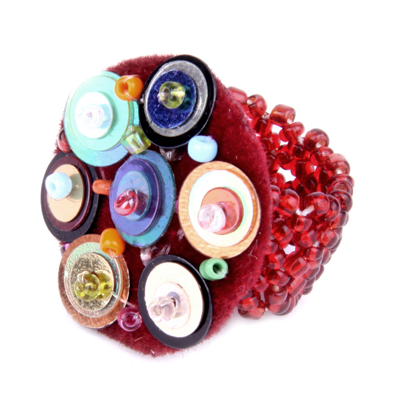 Sequin & bead applique ring. Colorful beads & sequins hand sewn onto a felt circle with a beaded stretch band.