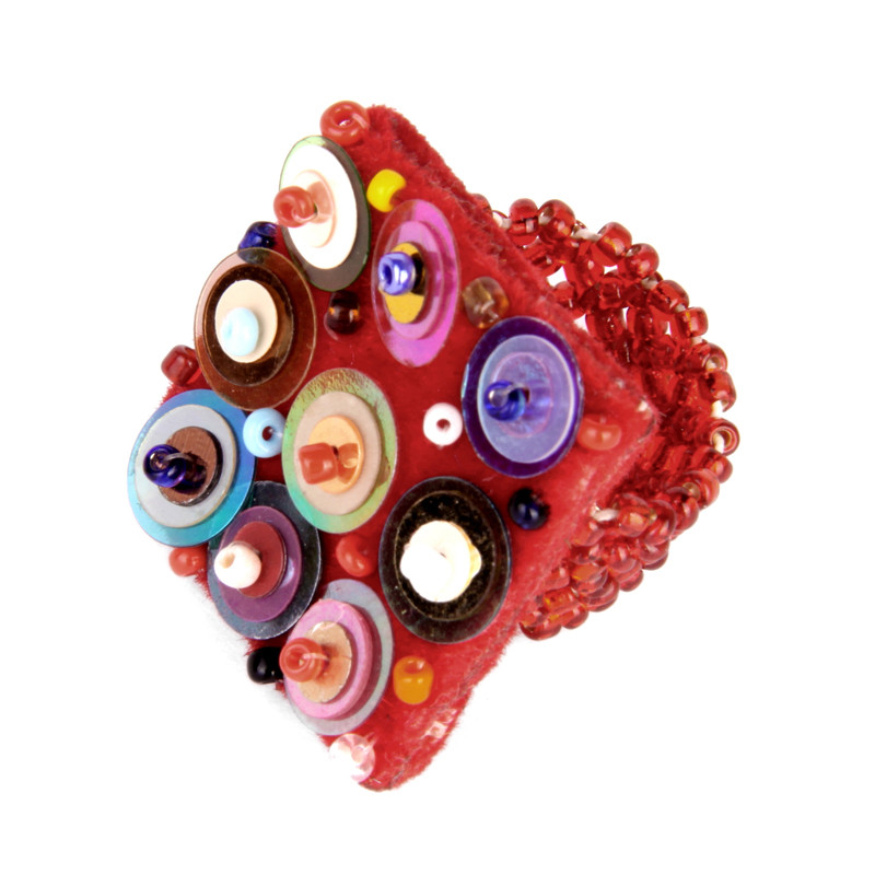 Sequin & bead applique ring. Colorful beads & sequins hand sewn onto a felt square with a beaded stretch band.