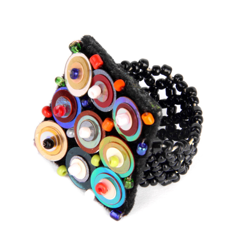 Sequin & bead applique ring. Colorful beads & sequins hand sewn onto a felt square with a beaded stretch band.