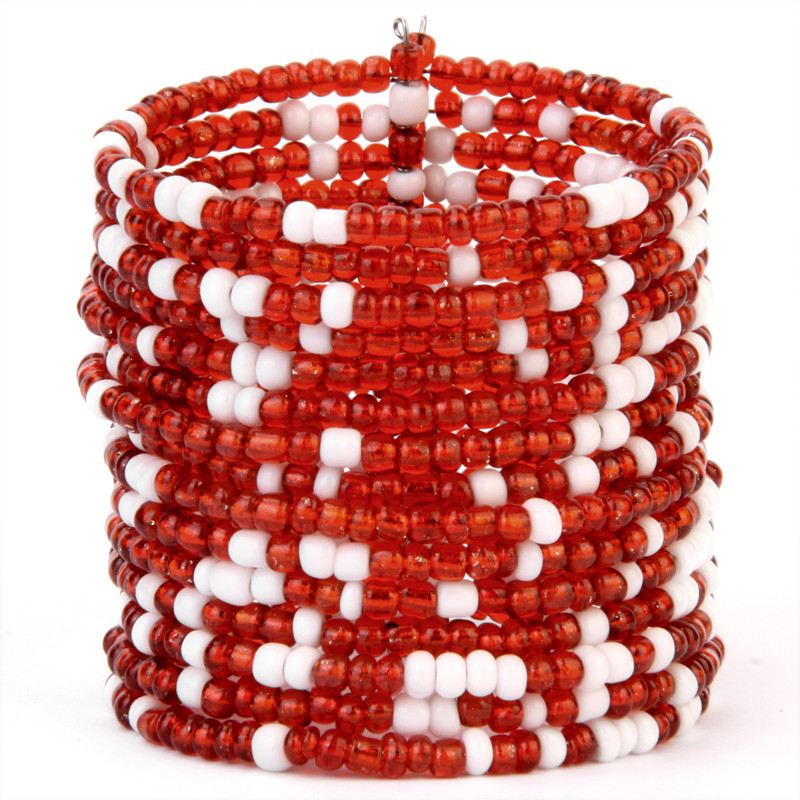 Rows glass beaded wire give the illusion of many bracelets, separate rows come together at side opening.