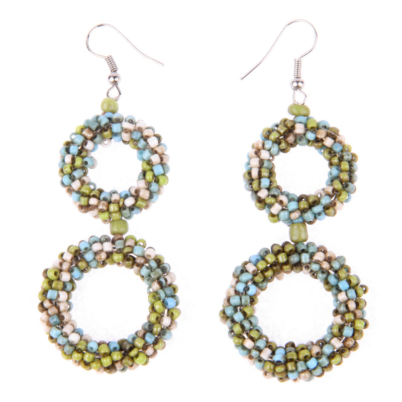 Beaded Donut 2 Circle Drop Earrings, Antique Turquoise, Lime, Cream.