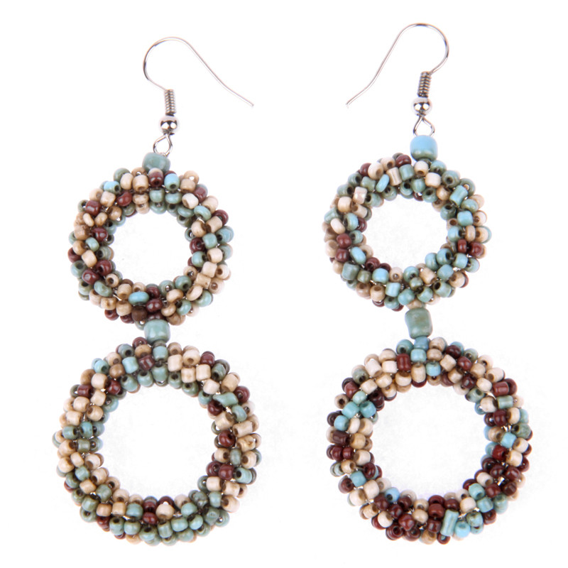 Beaded Donut 2 Circle Drop Earrings, Antique Turquoise, Brown, Cream.