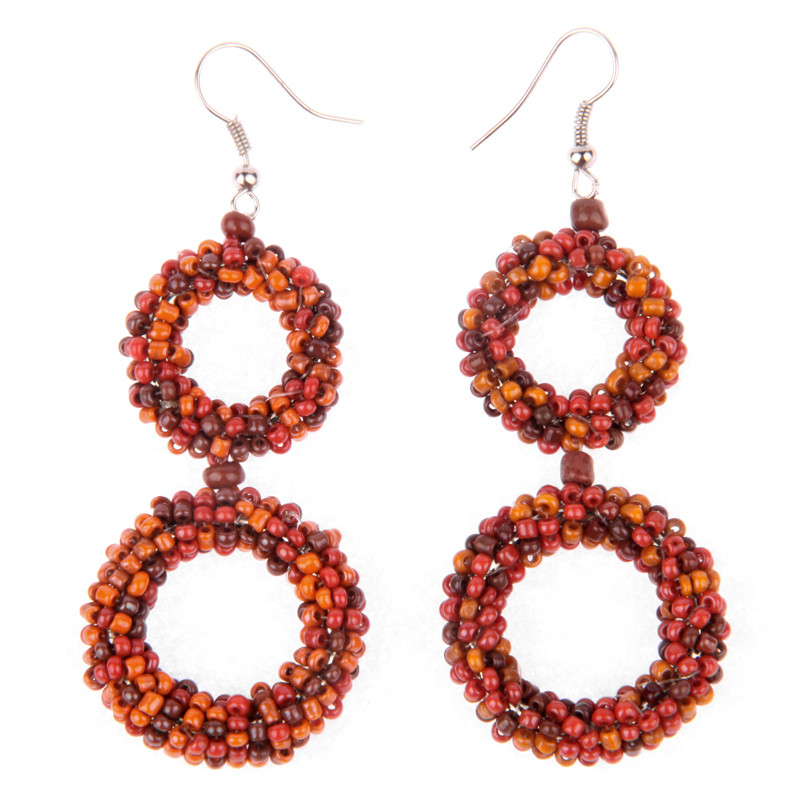 Beaded Donut 2 Circle Drop Earrings, Antique Orange, Coral, Brown.