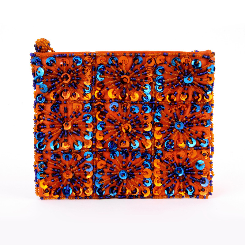 Sequin and Bead Squares Coin Purse in Orange & Blue.