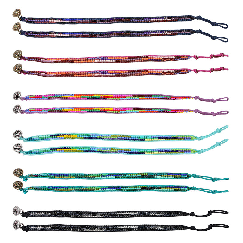 Glass beaded bracelets with cotton cord edge and metal button and loop closure.