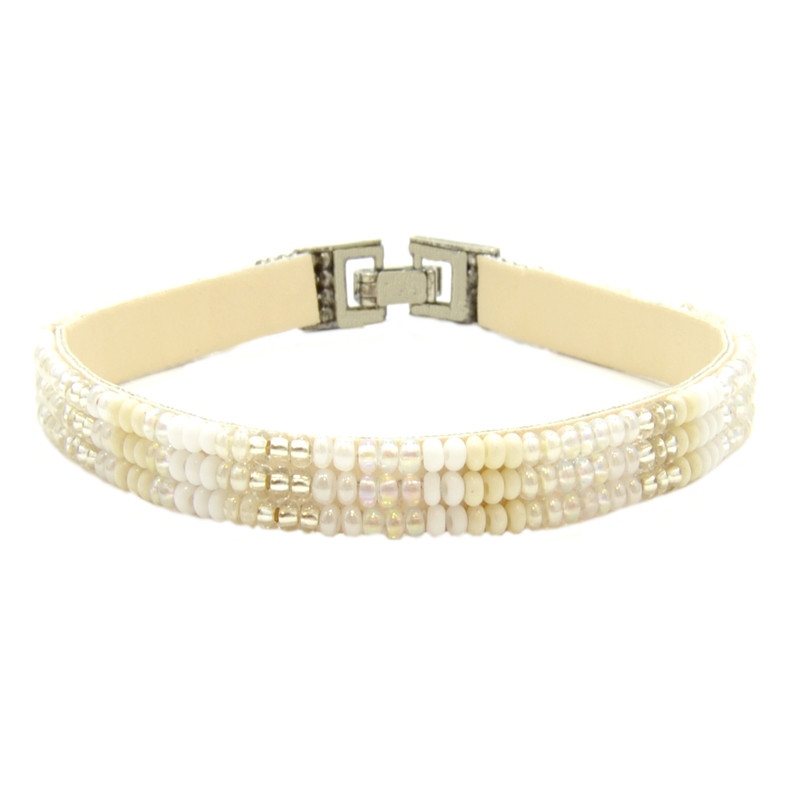 Glass beads, faux leather, thread, metal hardware.