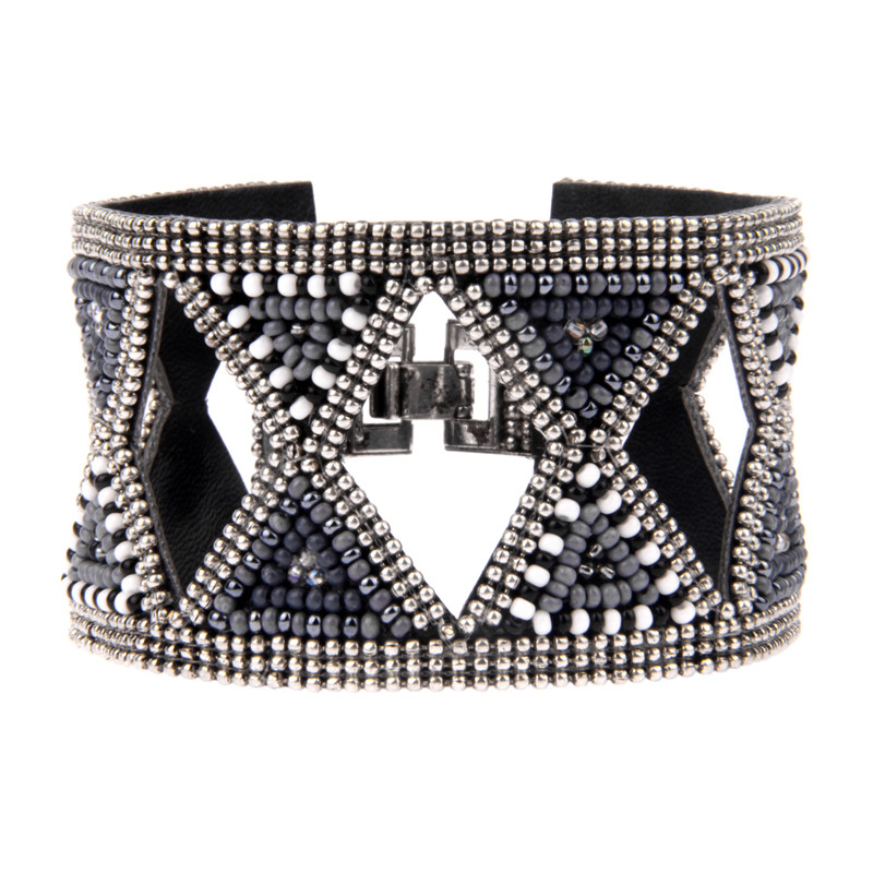 Soan hourglass pattern bracelet. Appliqued, metal clasp closure.