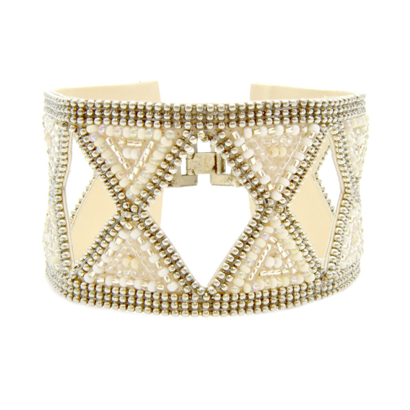 Soan hourglass pattern bracelet. Appliqued, metal clasp closure.