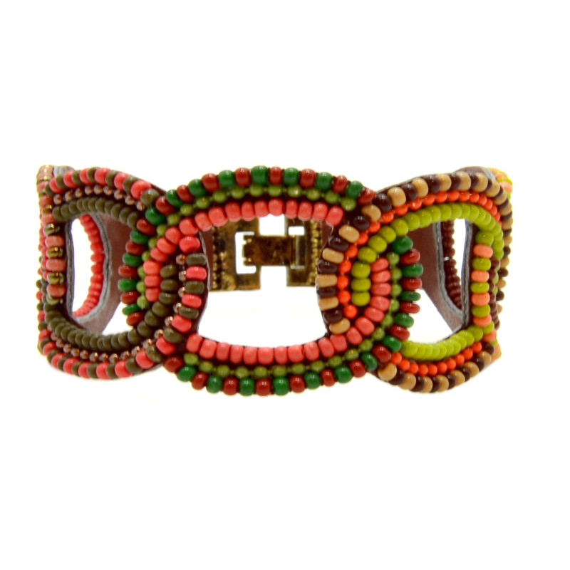 Glass beads, faux leather, thread, metal hardware.