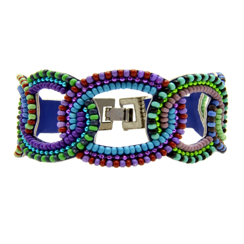 Glass beads, faux leather, thread, metal hardware.