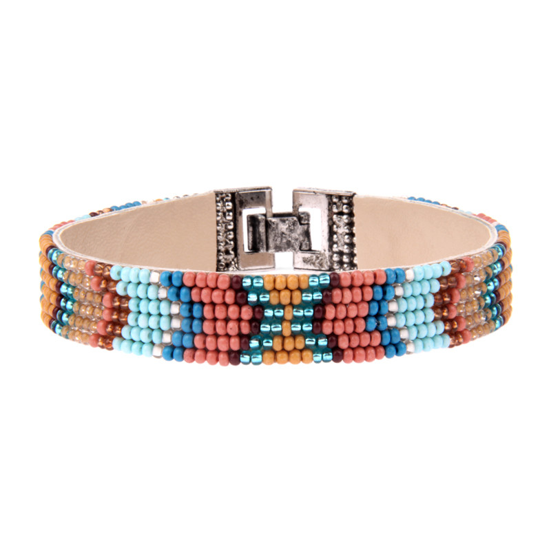 Soan 6 row arrow pattern beaded bracelet. Appliqued, metal clasp closure.