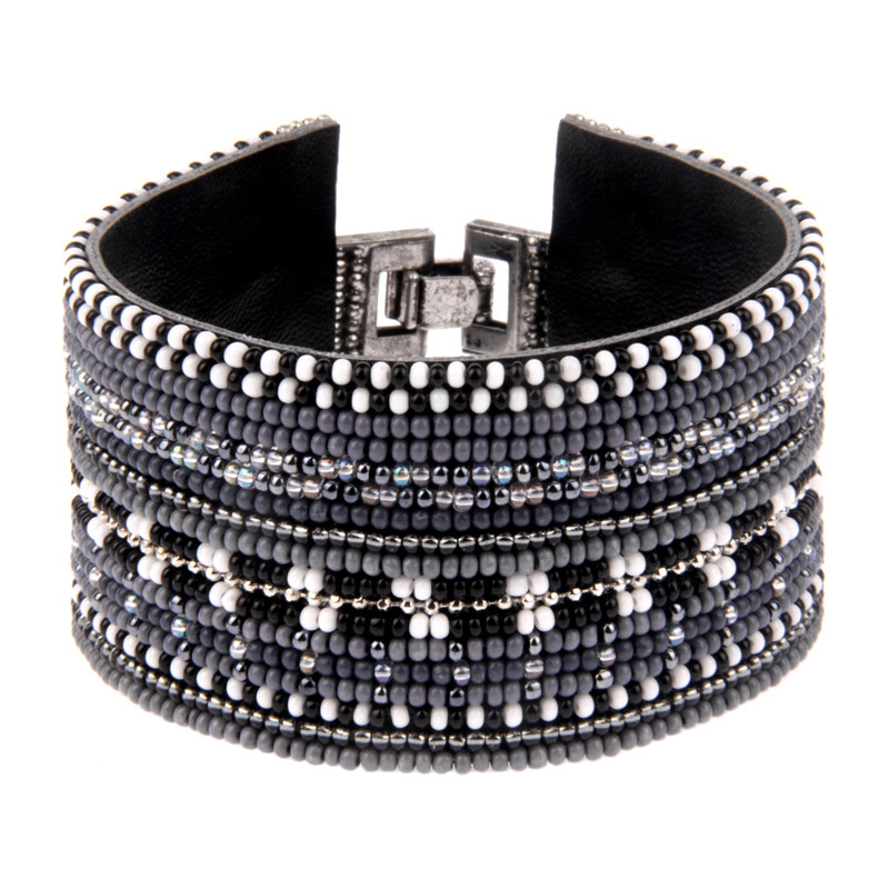 Glass beads, faux leather, thread, metal hardware.