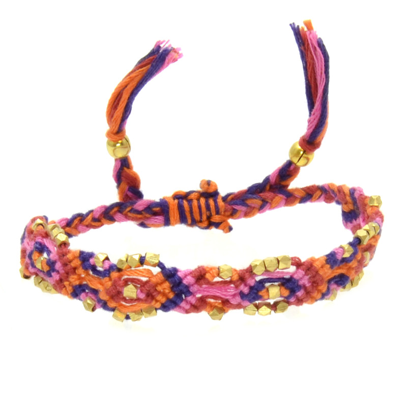 Woven Cotton & Metal Nugget Bracelet in Purple, Orange, Red, Pink.