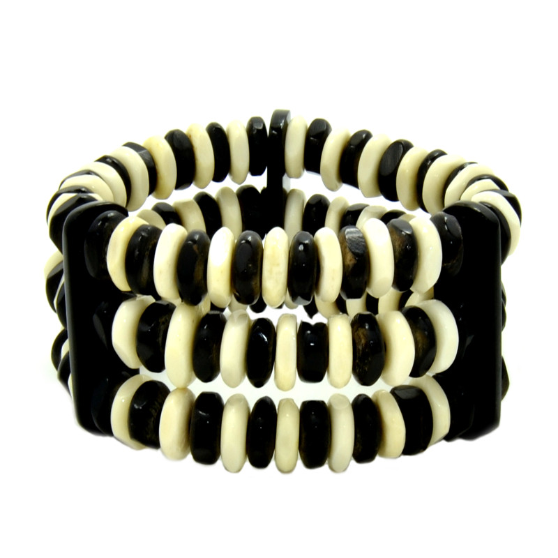Triple Row Horn Button Beads Bracelet, Black, White, Cream.