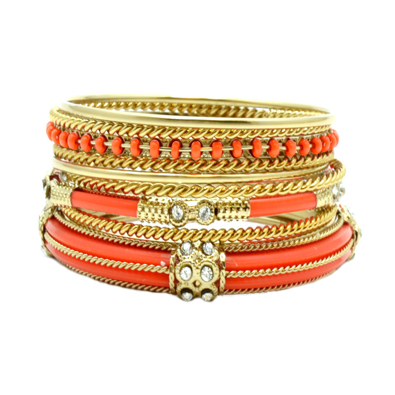 9pc Set of Gold Metal & Orange Resin Bangles w/ Crystal.