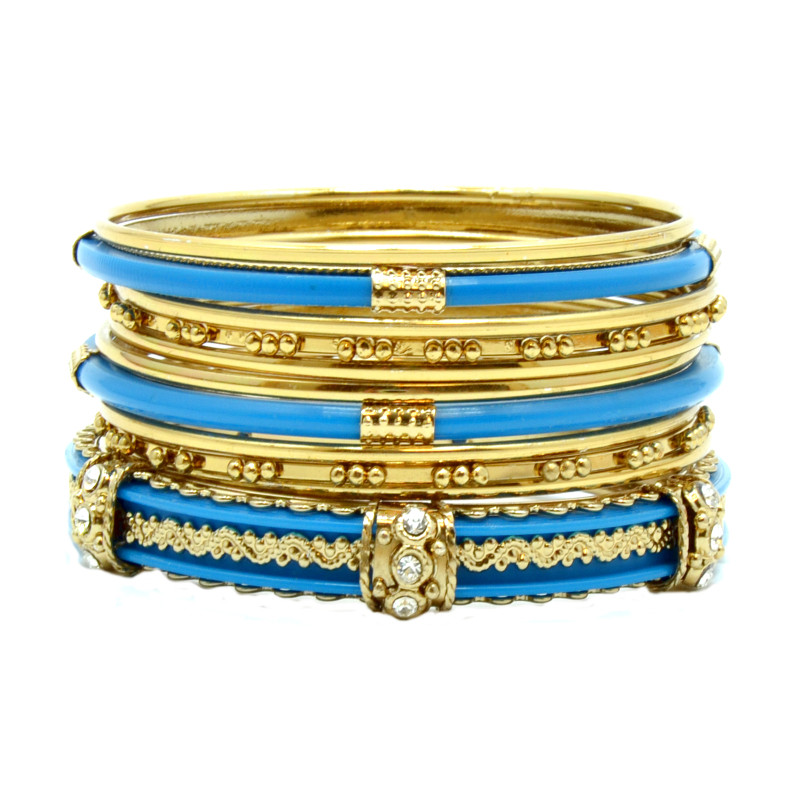 11pc Set of Gold Metal & Blue Resin Bangles w/ Crystal.