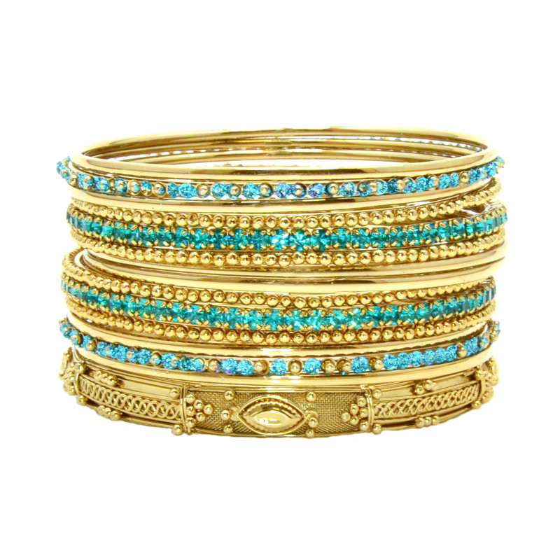 15pc Set of Gold Metal & Bangles w/ Aqua Crystals.