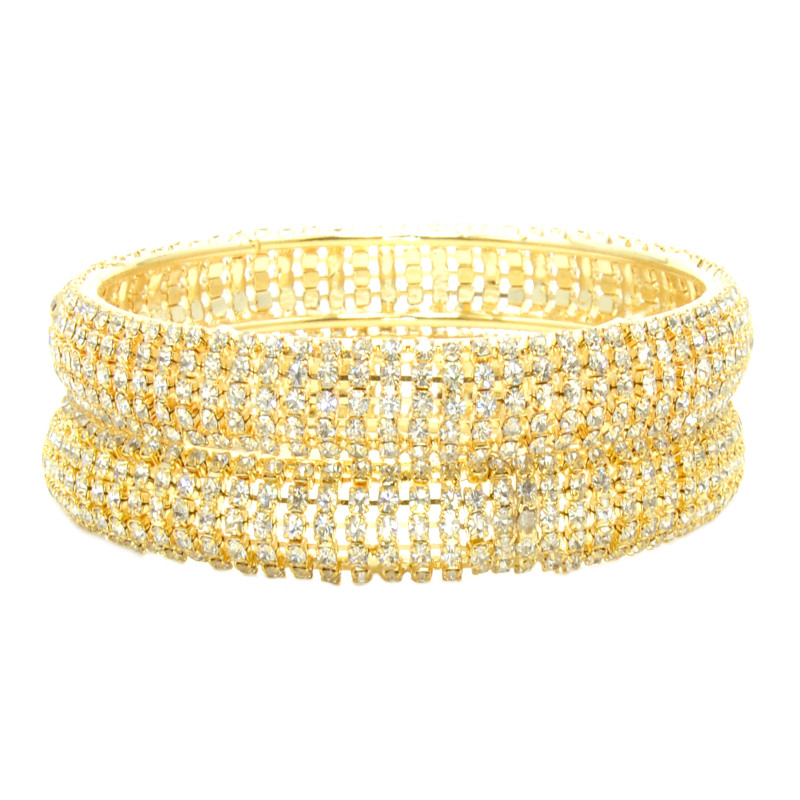 2 Pc Curved Edge Bangle Set Gold Metal & Clear Crystals.