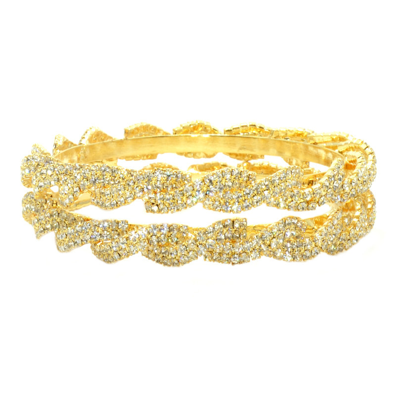 2pc Set Double Wave Row Metal Bangles in Gold, Clear Crystal.