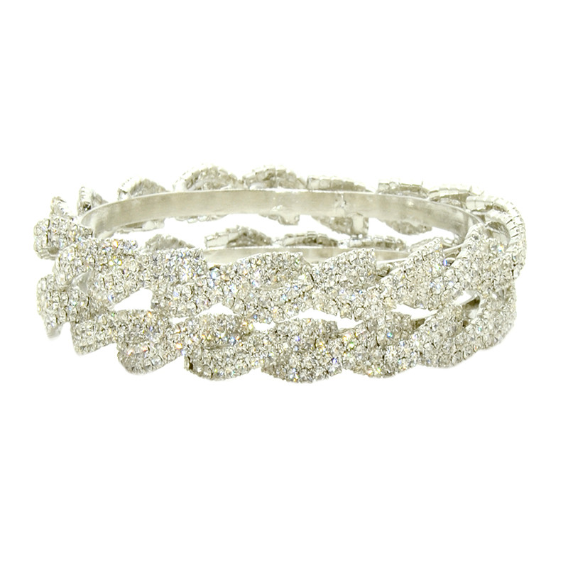 2pc Set Double Wave Row Metal Bangles in Silver, Clear Crystal.