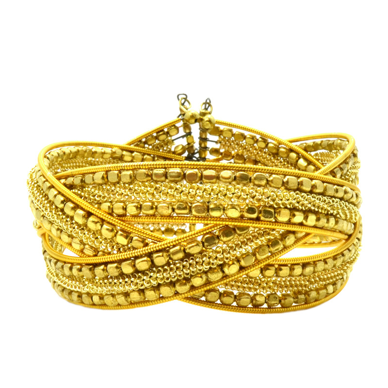 3 Row Braided Nugget Bead & Wire Cuff in Gold.